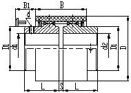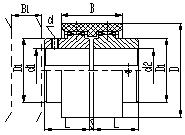 型號 | 公稱轉(zhuǎn)矩 Tn /N·m | 許可轉(zhuǎn)速[n] /r·min-1 | 軸孔直徑 d1、d2 | 軸孔長度 L J1 | D | D1 | B | B1 | S | d | 質(zhì)量m/kg | 轉(zhuǎn)動慣量I /kg·m2 | |||||